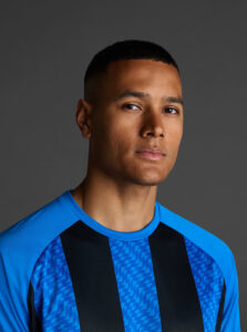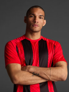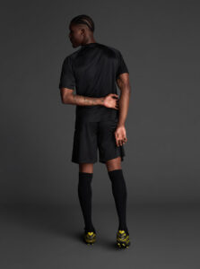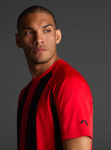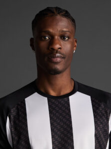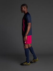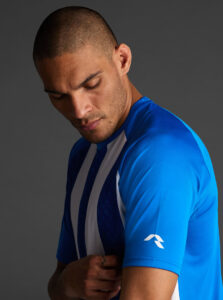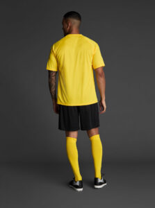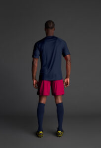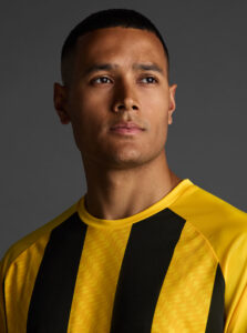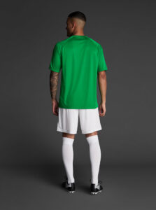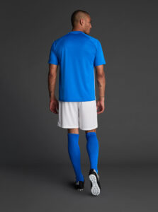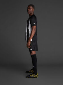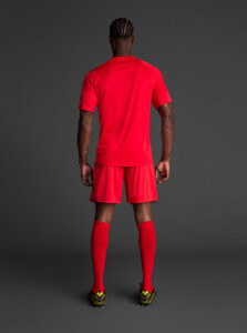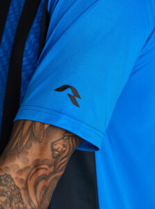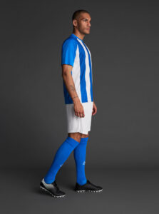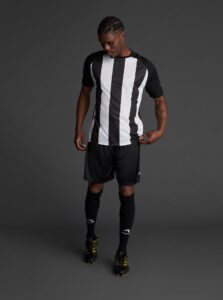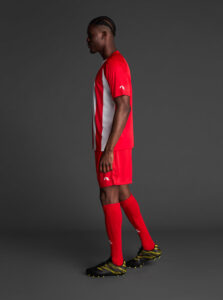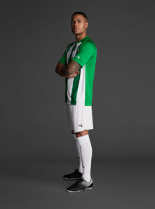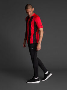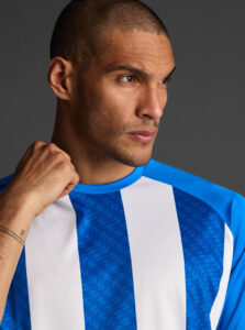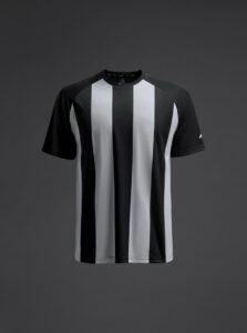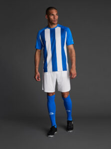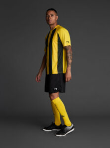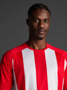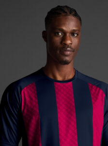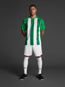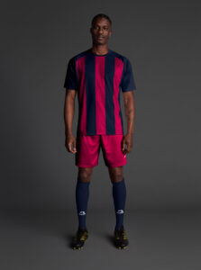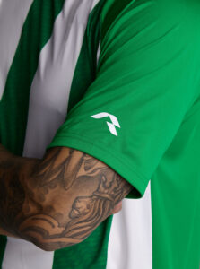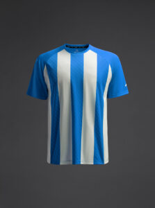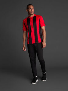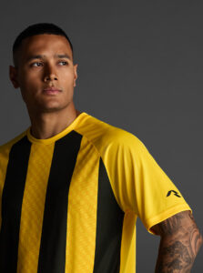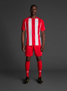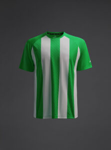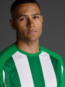 Unisex short-sleeved raglan soccer jersey made of recycled polyester. Sublimated front design with vertical stripes.      Wicking· Breathable