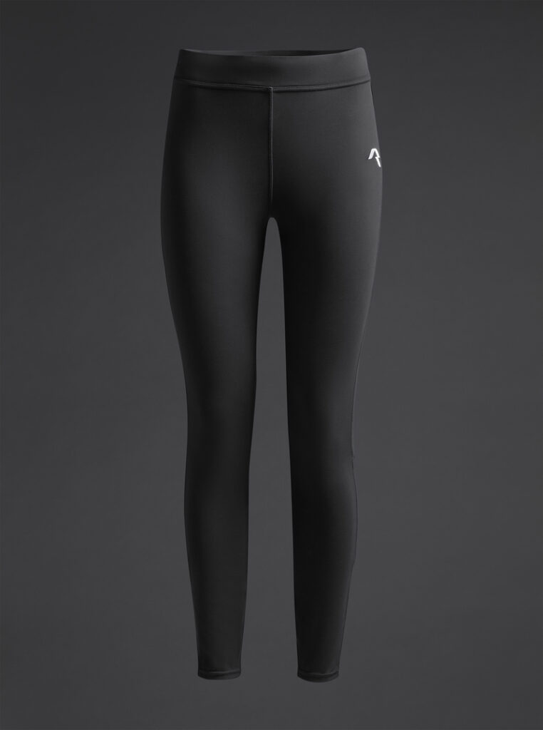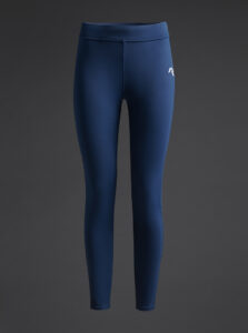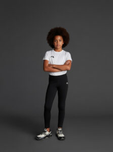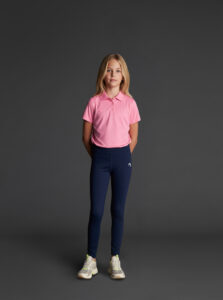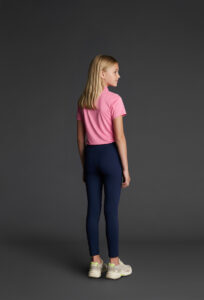 Girls' athletic leggings made of recycled polyester with elastane, featuring an elastic waistband and adjustable interior drawstring.· Stretch