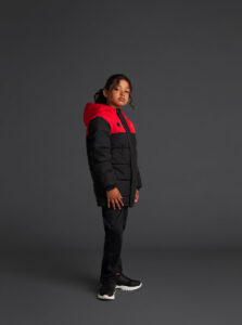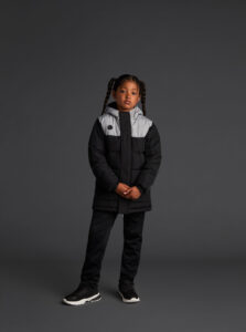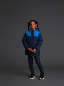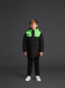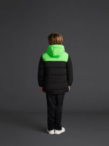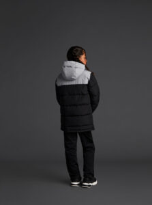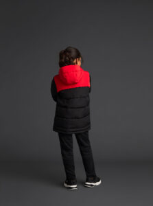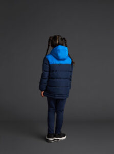 Kids' padded coat combined with fixed hood made of recycled polyester fabric.· Windproof· Padde protection