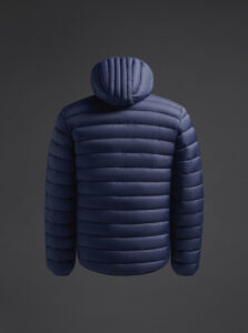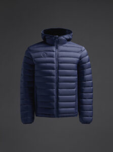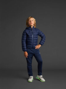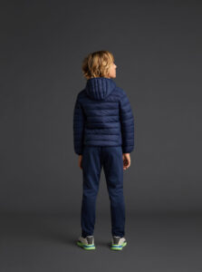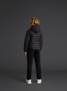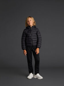 Kids' lightweight padded sports jacket with feather touch padding, with fixed hood, made of recycled polyester and polyamide fabric.· Windproof· Padde protection
