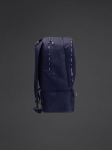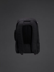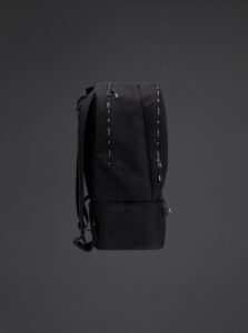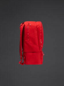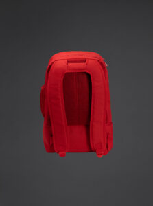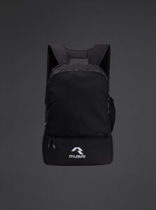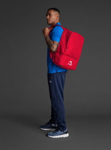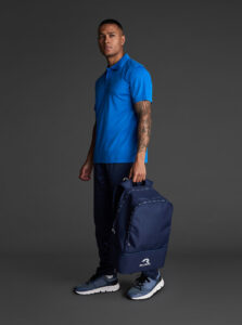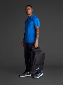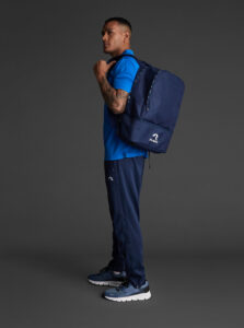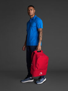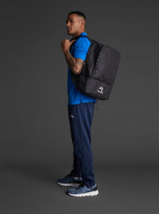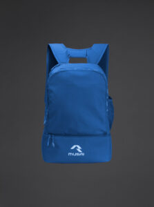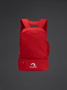 Waterproof sports backpack with large main compartment with double zip. Padded back and shoulder strap. Separate trainers pocket with breathable mesh material.